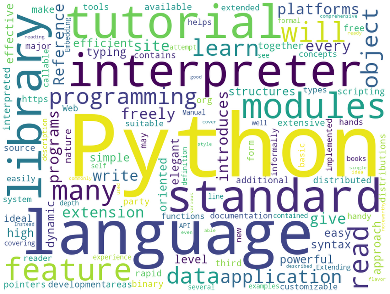 wordcloud = WordCloud(background_color='white', width=800, height=600).generate_from_text(tutorial_contents) plt.figure(figsize=(22,22)) #이미지 사이즈 지정 plt.imshow(wordcloud, interpolation='lanczos') #이미지의 부드럽기 정도 plt.axis('off') #x y 축 숫자 제거 plt.show()다음으로 .show() 함수를 이용하면 아래와 같은 데이터를 확인 할 수 있다.