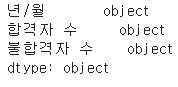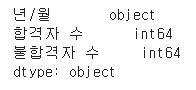 df['합격자 수'] = df['합격자 수'].apply(toint) df['불합격자 수'] = df['불합격자 수'].apply(toint)