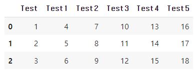 df = pd.DataFrame({'Test':[1, 2, 3], 'Test1':['4', '5', '6'], 'Test2':['7', '8', '9']}) df1 = pd.DataFrame({'Test3':[10, 11, 12], 'Test4':['13', '14', '15'], 'Test5':['16', '17', '18']})