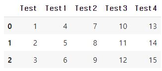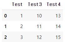df = pd.DataFrame({'Test':[1, 2, 3], 'Test1':['4', '5', '6'], 'Test2':['7', '8', '9']}) df1 = pd.DataFrame({'Test':[1, 2, 3], 'Test3':['10', '11', '12'], 'Test4':['13', '14', '15']})조건으로는