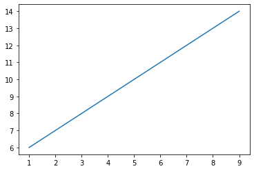 a = np.arange(1, 10) b = a+5 plt.plot(a, b) plt.figure(figsize=(20, 10)) plt.show()