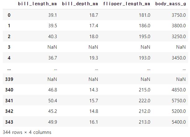 bill_length_mm, bill_depth_mm, flipper_length_mm, body_mass_g 컬럼 만 추출 해 보자.