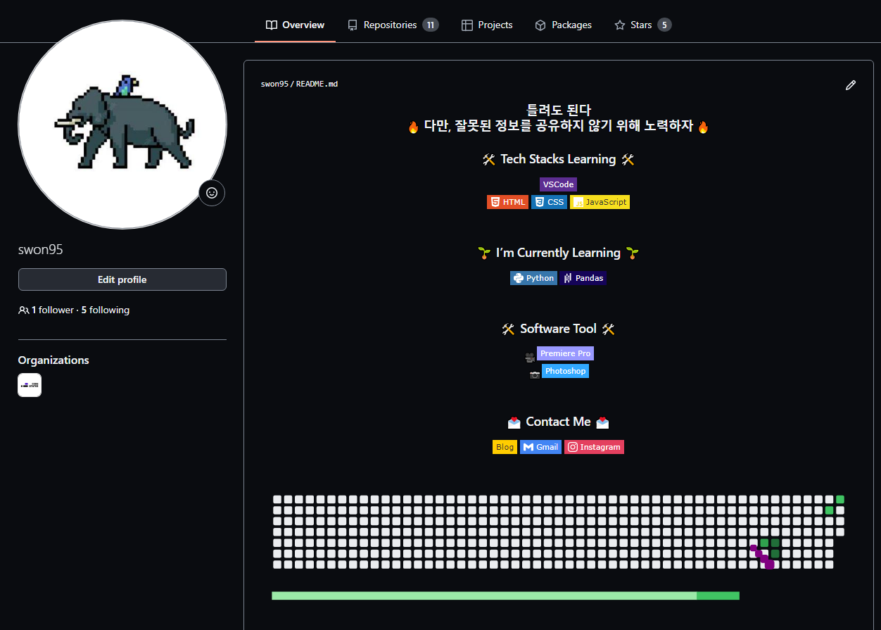 현재 나의 깃허브 프로필의 상태이다.